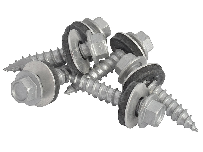 The screws have a rubber washer beneath the aluminium flange which expands under pressure and forms a permanent weather seal. They are zinc plated and have an 'Elementech' coating for superior corrosion resistance, which has been salt spray tested to 1,000 hours.