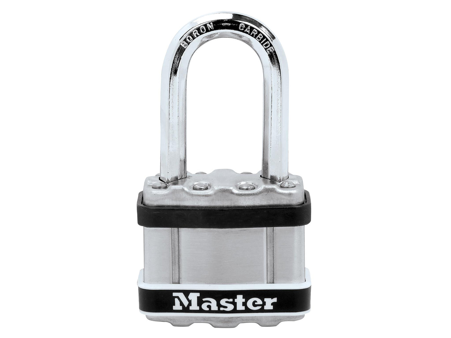 The Master Lock Excell™ Laminated Stainless Steel Padlock has a laminated steel body encased in a stainless steel body cover for maximum strength and weatherability. Its octagonal shackle is made of chrome-plated boron carbide, 50% harder than hardened steel, offering maximum resistance to cutting and sawing. The 4-pin cylinder prevents picking and the dual locking ball bearings provide maximum resistance against prying and hammering.