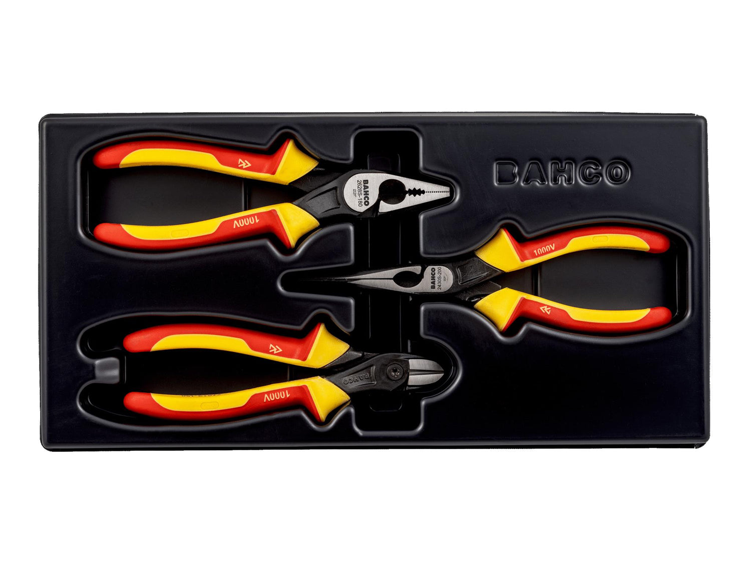 The Bahco ERGO™ All-Round Insulated Pliers Set includes a selection of pliers with an ergonomic design for maximum comfort with minimum effort. Suitable for working on live equipment up to 1,000V in compliance with IEC 60900. Made from high-performance alloy steel with a phosphate finish, anti-corrosion treated. Supplied packed in a plastic tray, inside a cardboard box.