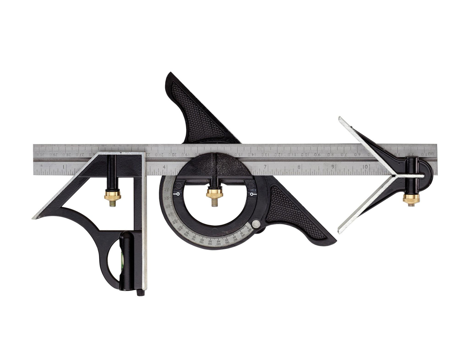 The Hultafors 58ME Combination Square has a lightweight zinc stock and rule with ground edges and ends. Its centre head enables the accurate location and marking of the centre of circular items. The graduated protractor head can be turned through 360° for measuring and constructing angles. For use outside and inside as a try square, mitre square, depth and marking gauge.