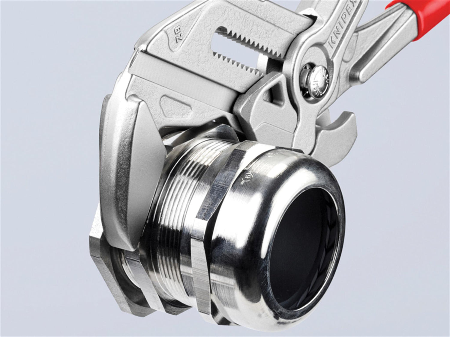The Knipex 86 03 Series Pliers Wrench with dipped PVC handles and smooth parallel jaws for cautious installation of plated fittings or sensitive surfaces. More effective, faster and greater capacity than an adjustable spanner of the same size.