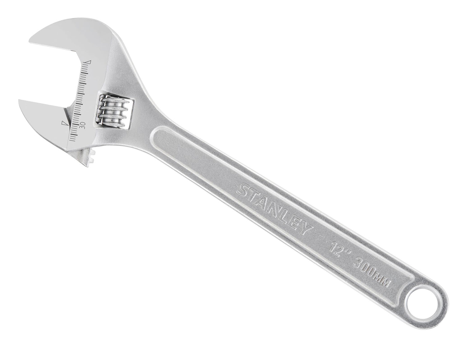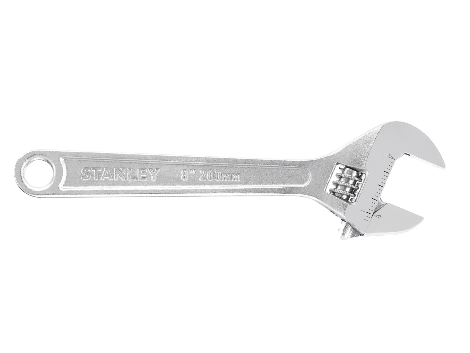 STANLEY® Metal Adjustable Wrench with parallel jaws placed at a 15° angle to provide a firm grip and good reach. The jaws feature both metric and imperial scales. There is also a hanging hole that can be used for securing the tool to a lanyard, ideal when working at height.
