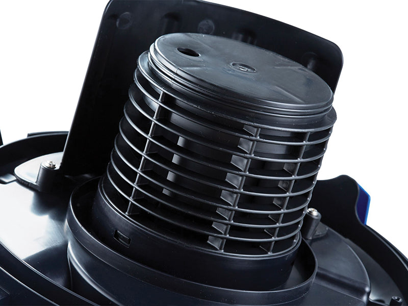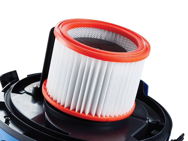 It has a 30L plastic canister which has a dry capacity of 16L and a wet capacity of 14L, and is supplied with a washable cartridge filter and fleece filter dust bag. The washable cartridge filter means you can move from dry to wet use without removing the filter. Can be used with or without the fleece filter bag.