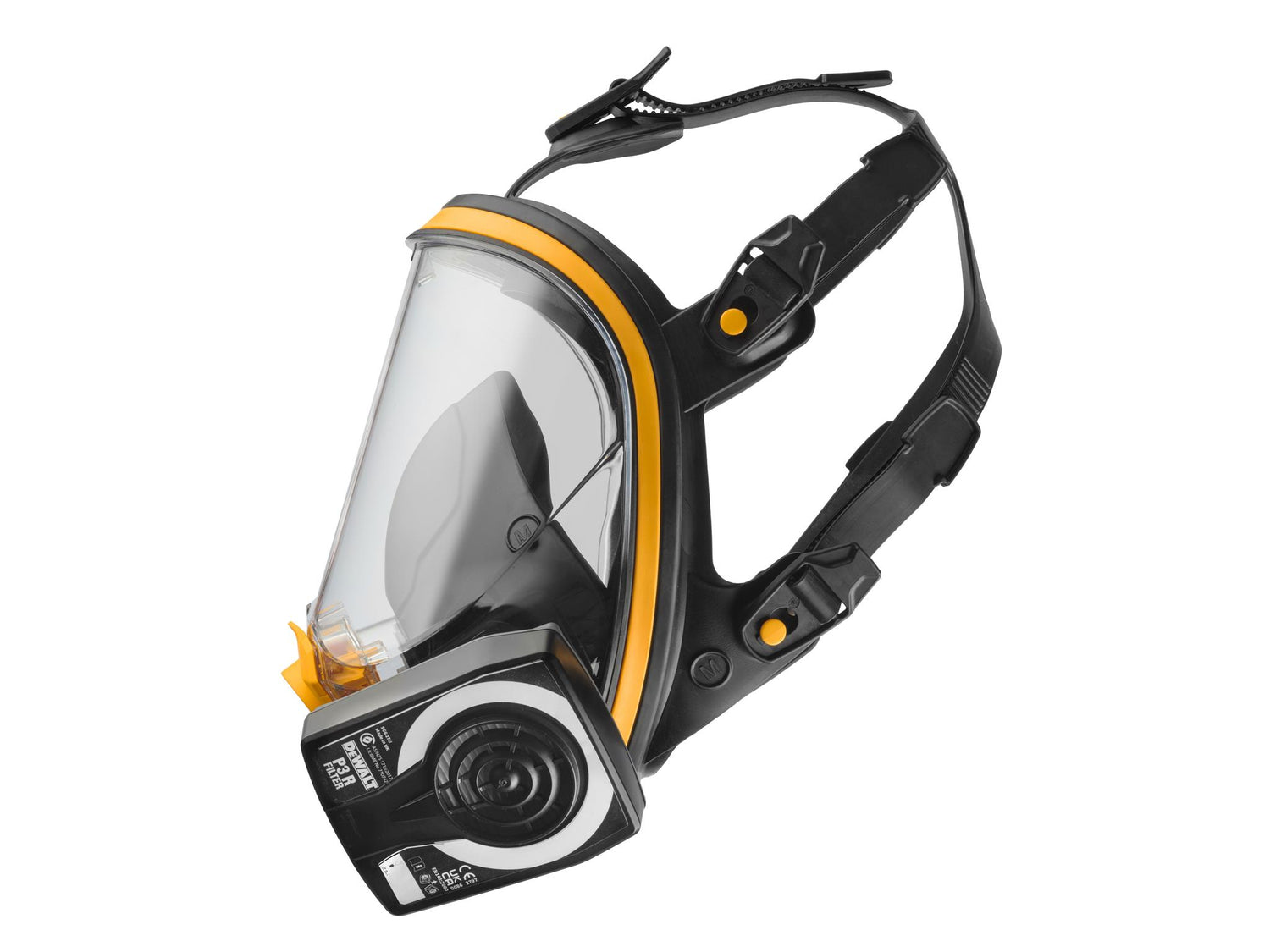 DEWALT Reusable Full Mask Respirator with P3 filters. Provides protection in workplaces which have high incidences of fine dust, lead, silica, MDF particles, or other forms of industrial pollutants in the air.