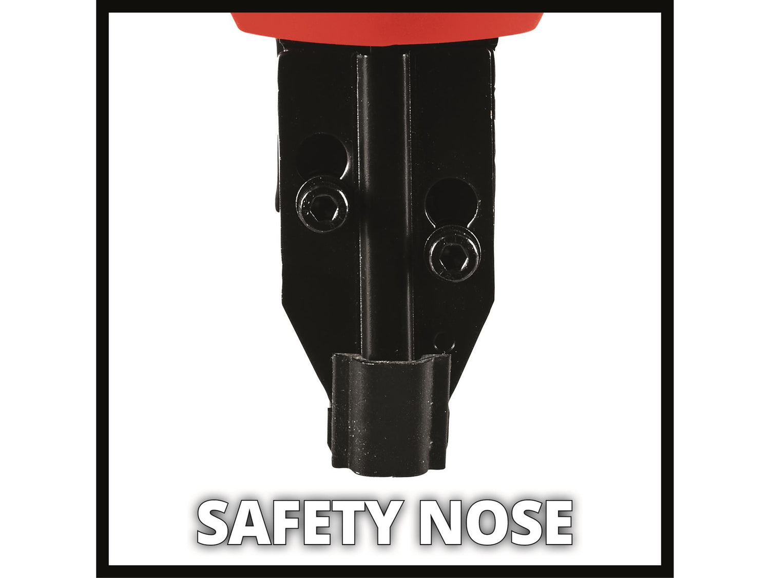 The magazine has a level indicator providing an overview of the current load and maximum capacity of 100 nails or clamps, all securely held by a magnet. It can be easily opened and refilled at the push of a button. The pressure mechanism on the stapler nose allows safe working, while large softgrip surfaces offer comfortable and firm hold.