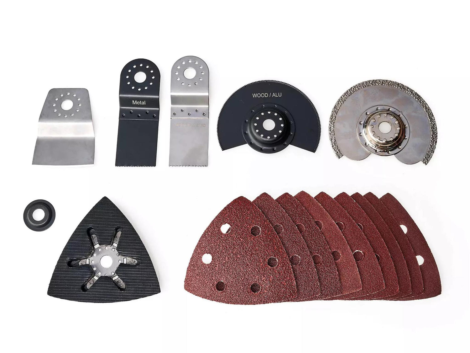 Supplied with: 1 x Delta Sanding Shoe with Velcro Fastener, 1 x Diamond Segment Saw Blade for tile joints, 1 x Segment HSS Saw Blade for wood, plastic and soft metal, 1 x BIM Plunge Cut Saw Blade for metal and 1 x HCS Plunge Cut Saw Blade for wood and plastic.