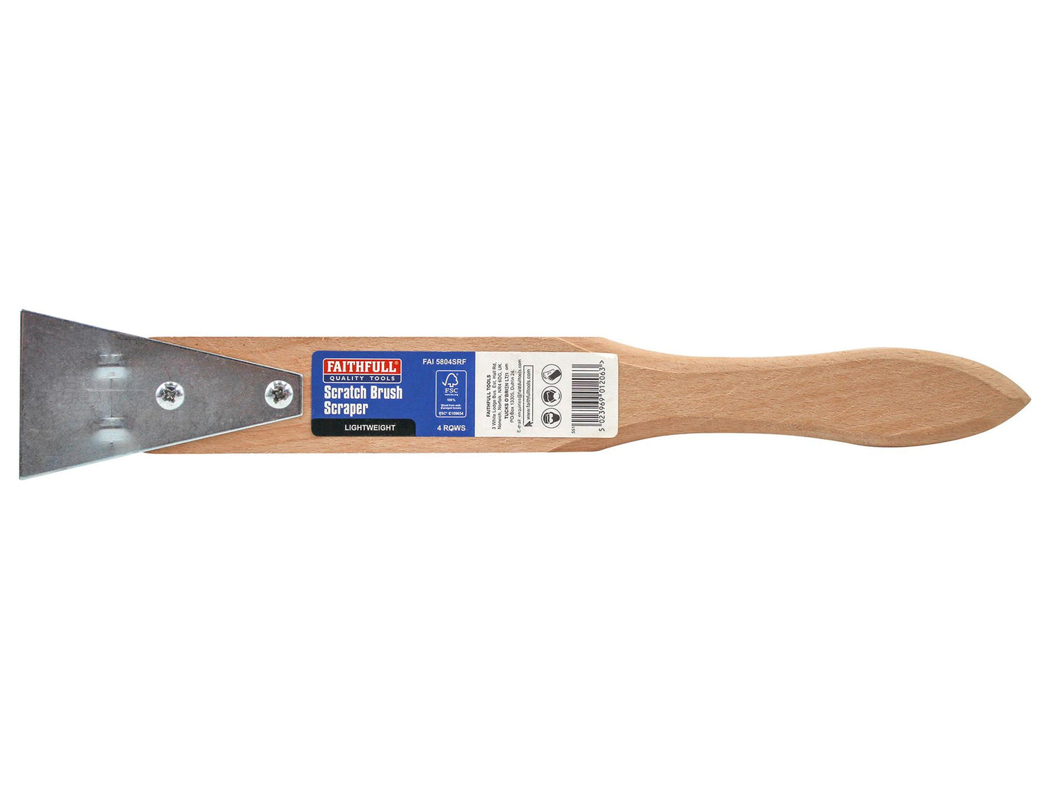 The Faithfull Lightweight Scratch Brush with Scraper. Ideal for preparatory work such as removing rust, scale, old paintwork and grouting. It features 28 gauge wire bristles hardened and tempered to provide longer-lasting abrasion. The handle is made from durable FSC beech wood and has been drilled for hanging, making it easy to store and access whenever you need it.