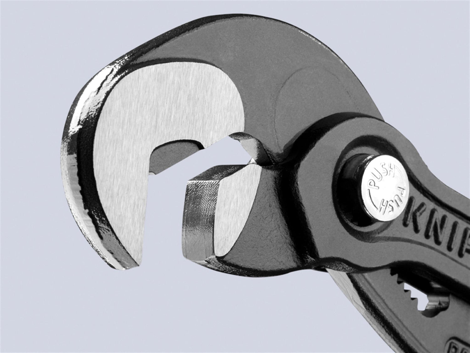 The Knipex KPX8741250 multiple slip joint plier is a combination tool that offers the convenience of the comfortable push-button adjustment on the workpiece and the function of an adjustable spanner.