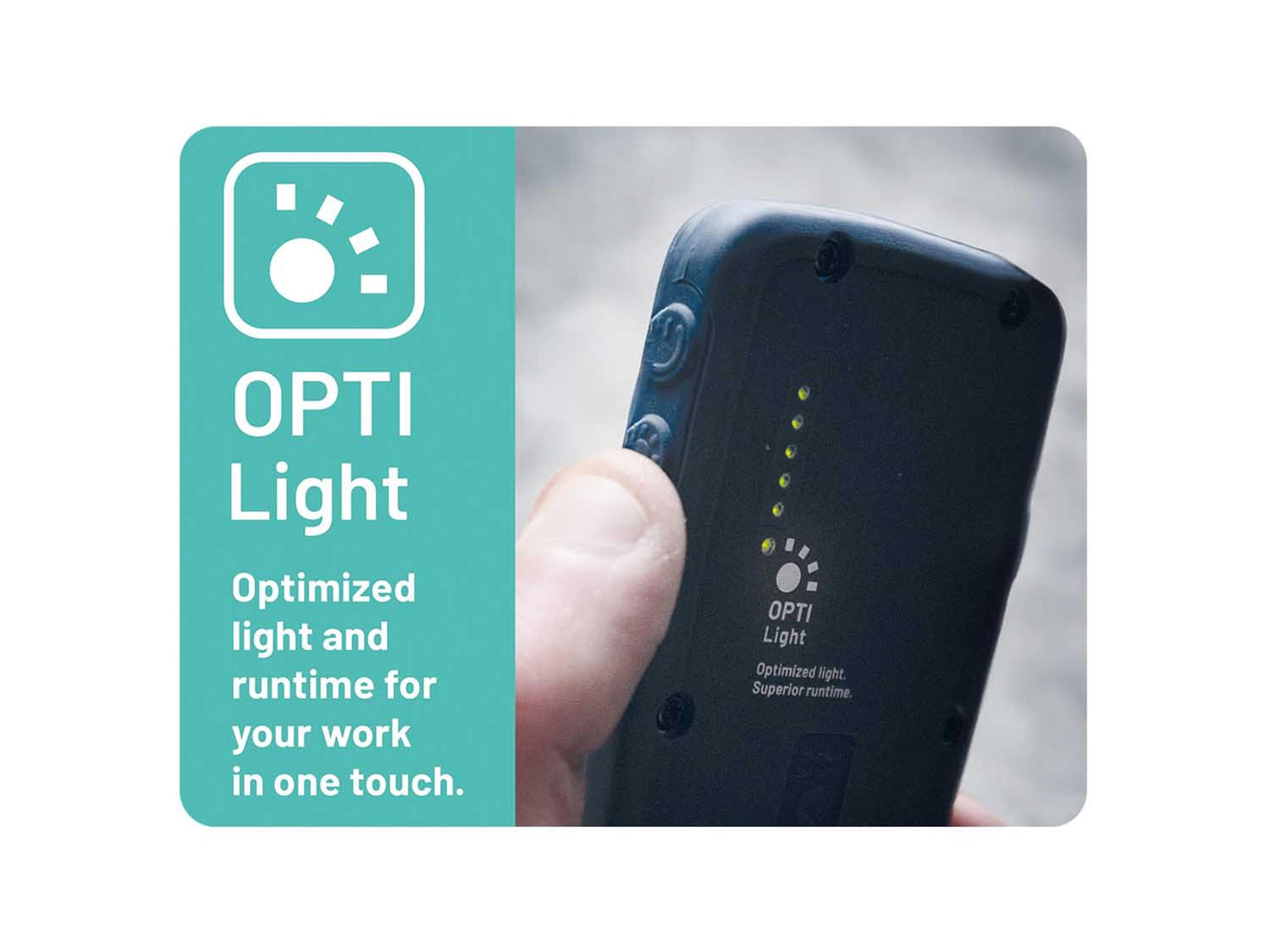 The OPTILight setting delivers the required illuminance (LUX) in a typical work situation, ensuring optimized light and runtime with a simple touch. This work light provides a constant lumen output performance measured according to the European standard EN 13032-1.